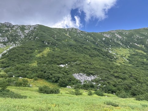 登山開始から約1時間で乗越浄土へ。ここから先は本格的な稜線歩き。風が心地よく、汗ばむ体を冷やしてくれる。11時32分、宝剣山荘に到着。小休止を挟み、天狗荘、中岳と順調に進む。