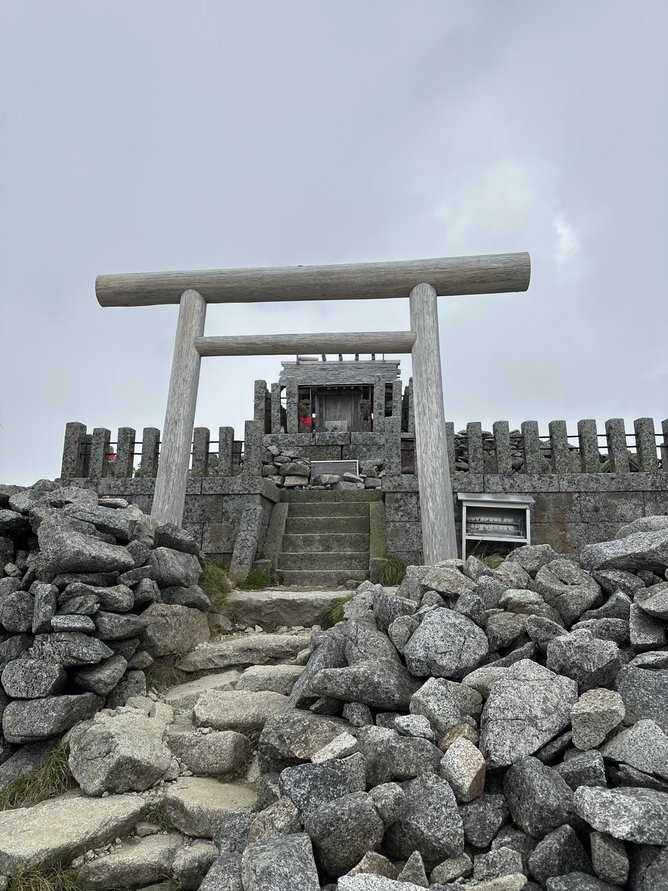 11時56分、木曽駒ヶ岳頂上山荘に到着。そして12時、ついに木曽駒ヶ岳の頂へ。標高2,956m。眼下には南アルプス、遠くには御嶽山が望める。風は涼しく、空は澄み渡り、まるで時間が止まったかのような静寂が広がっていた。